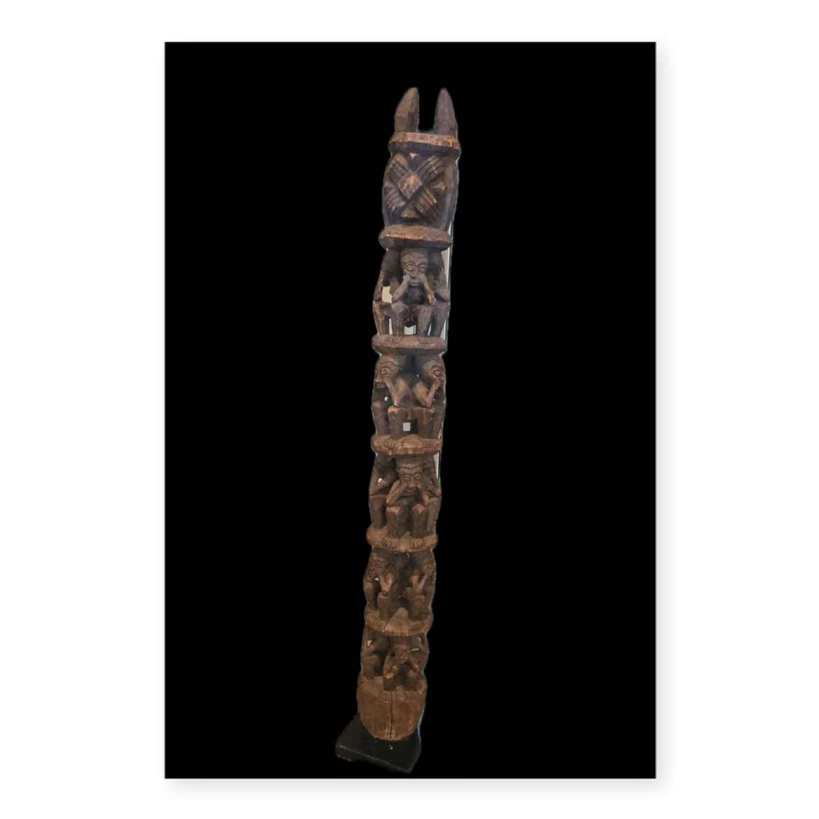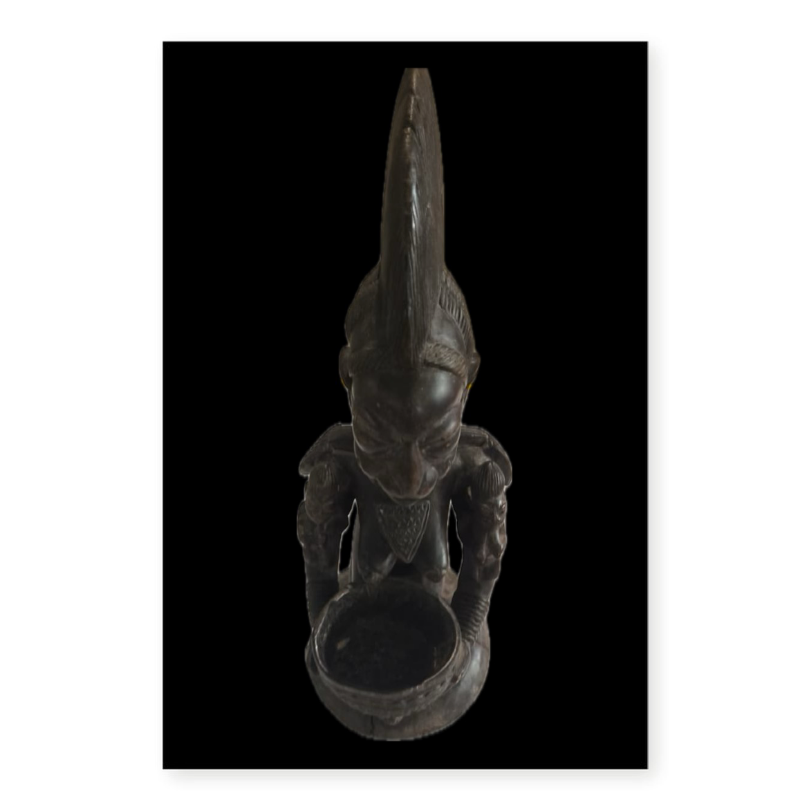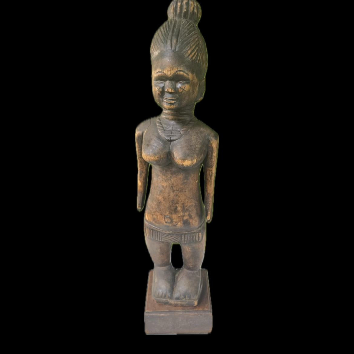 - Materials: Carved from several west African woods and finished with a natural pigment stain, giving it a smooth, luminous surface.